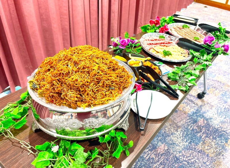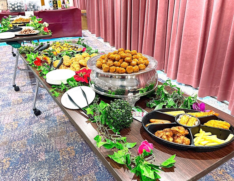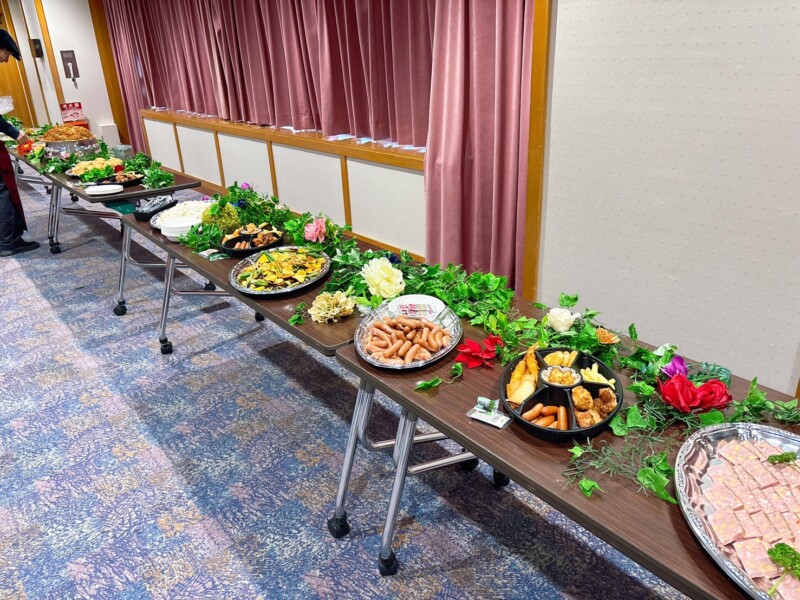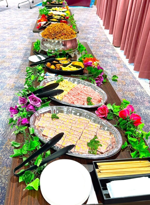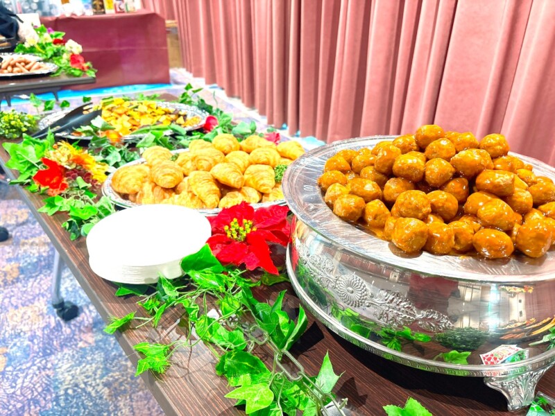 ホットメニューには、甘辛い味付けで人気のミートボールや、ジューシーな唐揚げ、ボリューム感のある焼きそばなどをラインナップ。立食形式でも取り分けやすい大皿盛りで、会話の合間にも気軽にお召し上がりいただける構成です。