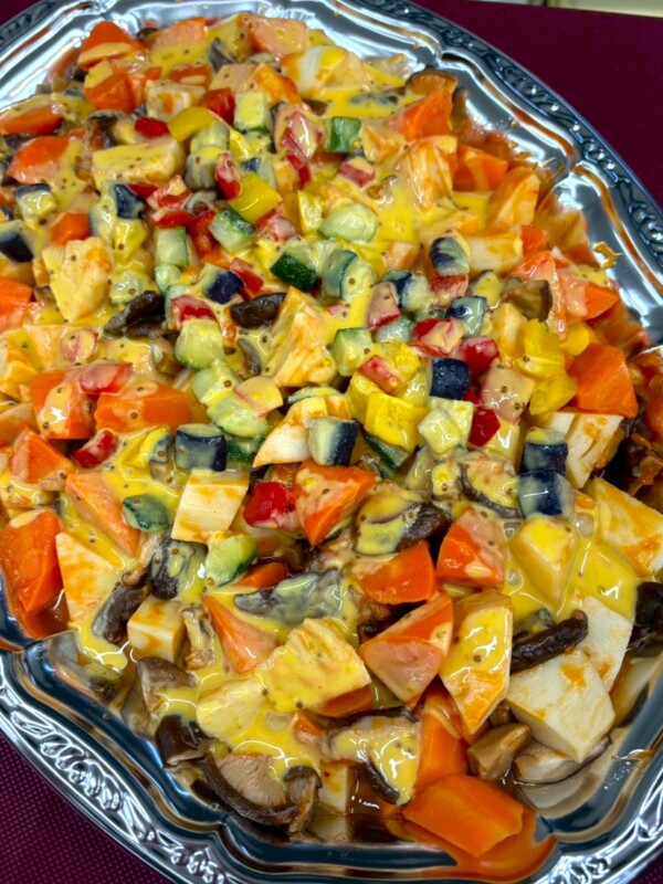とうもろこしの甘み、豆や根菜の食感、野菜それぞれの個性が引き立つ、見た目も華やかな一品です。