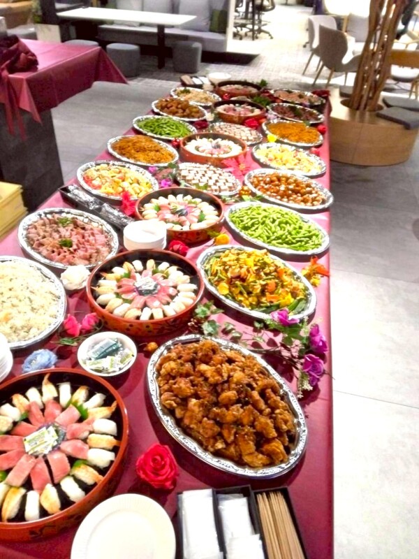 シルバーのプレートに盛られた色鮮やかな料理が並び、バラの装飾を添えることで、社内会議室がまるで高級レストランのビュッフェ会場のような、