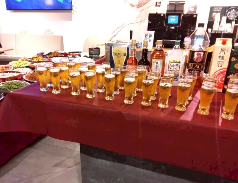 並べられたグラスに注がれた琥珀色のビールは、会場の装飾の一部としても美しく映えていました。