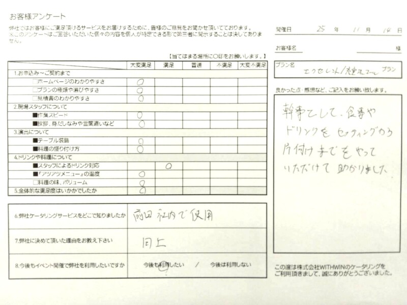「幹事として、食事やドリンクをセッティングから片付けまでをやっていただけて助かりました」