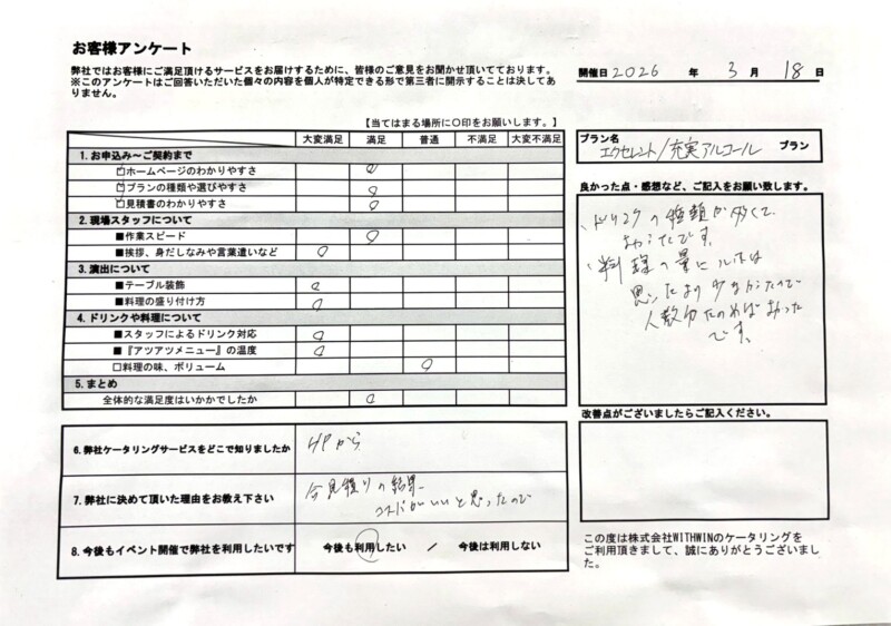 今後も皆さまにご満足いただけるケータリングサービスを目指してまいります。
