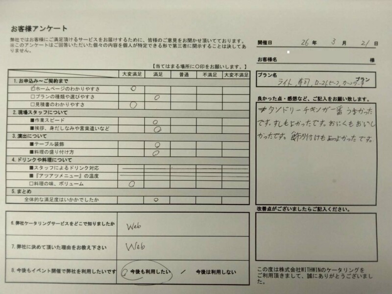 当日、パーティーを楽しまれたお客様より、大変嬉しいアンケート回答をいただきました。